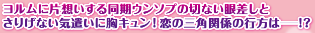 ウンソプに恋愛相談するヨルム。スヨンへの想いを口にするヨルムに対し、自分の気持を伝えられず切なく見守る。